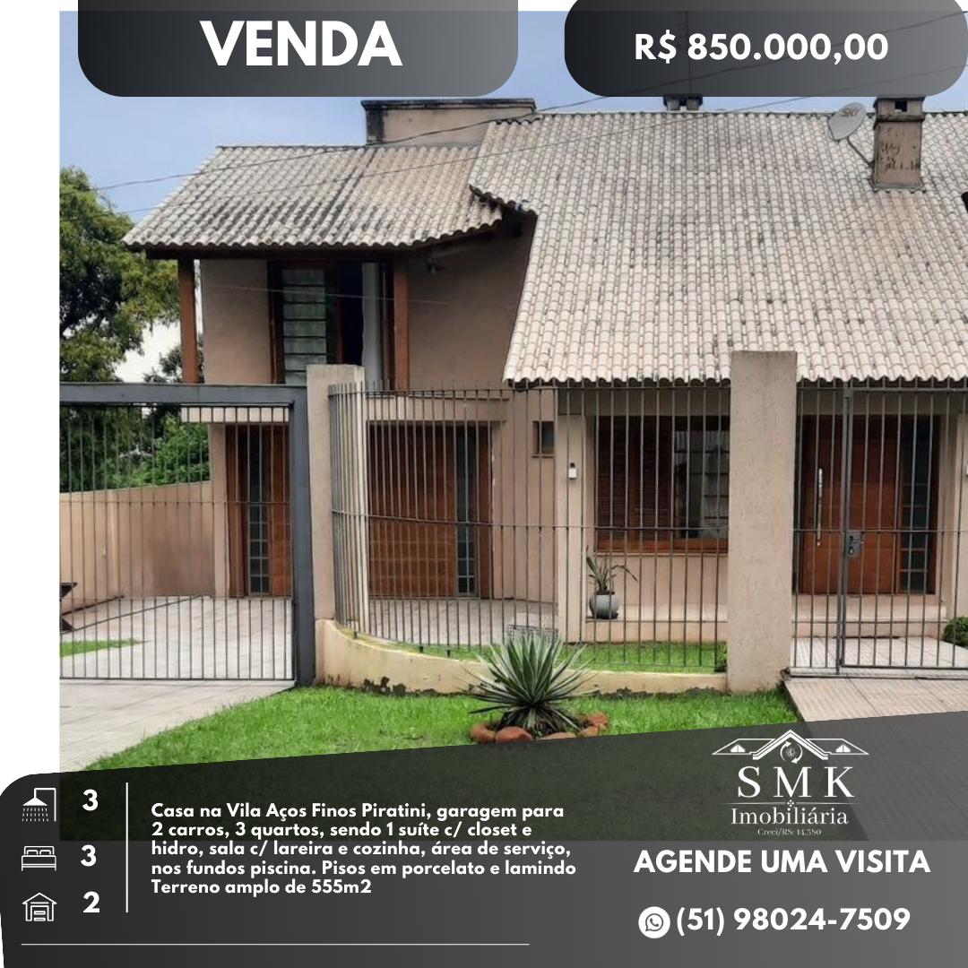 VENDIDA *ótima localização *móveis planejados *pisos em porcelanato e laminado # 3 dormitórios(1 suíte) # 1 sala c/ lareira # 3 banheiros # cozinha projetada # garagem para 2 carros # área de serviço # piscina 6x2,7 # Área construída 192m2 # Terreno 555m2 * Localizado na Vila AFP em Charqueadas/RS == R$ 850.000,00 == * Imóvel dentro do Núcleo na Vila AFP. == Vem conhecer (51)9 80247509